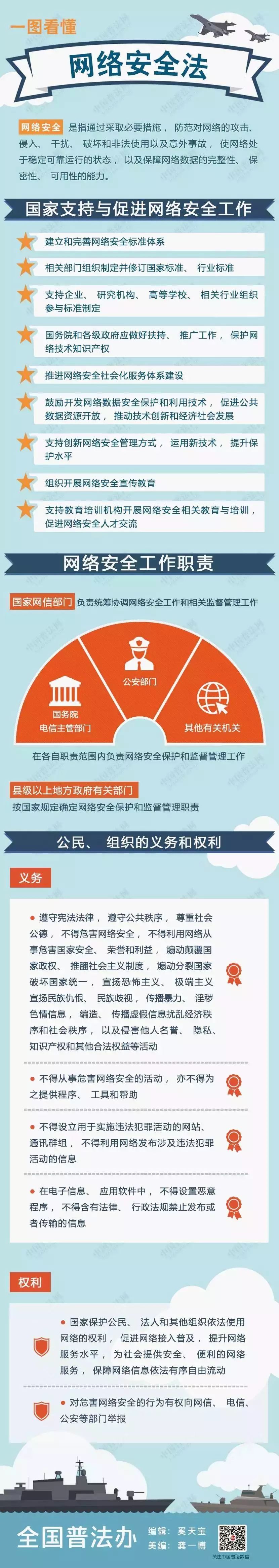 《中华人民共和国网络安全法》是为保障网络安全,维护网络空间主权和国家安全、社会公共利益,保护公民、法人和其他组织的合法权益,促进经济社会信息化健康发展制定。由全国人民代表大会常务委员会于2016年11月7日发布,自2017年6月1日起施行。